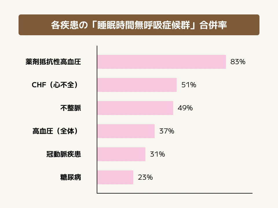 無呼吸の間は血液中の酸素が足りなくなるので、心臓や血管に大きな負担がかかります。そのため「心筋梗塞」や「心不全」などの心疾患には4倍、「高血圧」には2倍かかりやすくなるというデータがあります。