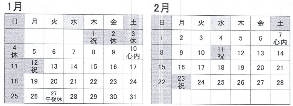 1月・2月診療カレンダーと心療内科のお知らせ